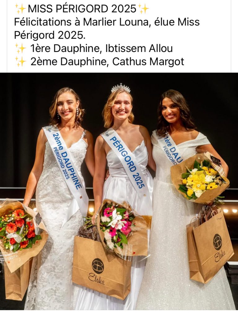 Félicitations à Lola Turpin élue Miss Périgord 2023 ainsi qu’à Audrey Laurent 1ère dauphine, et Kathy Wlazinski 2ème dauphine.