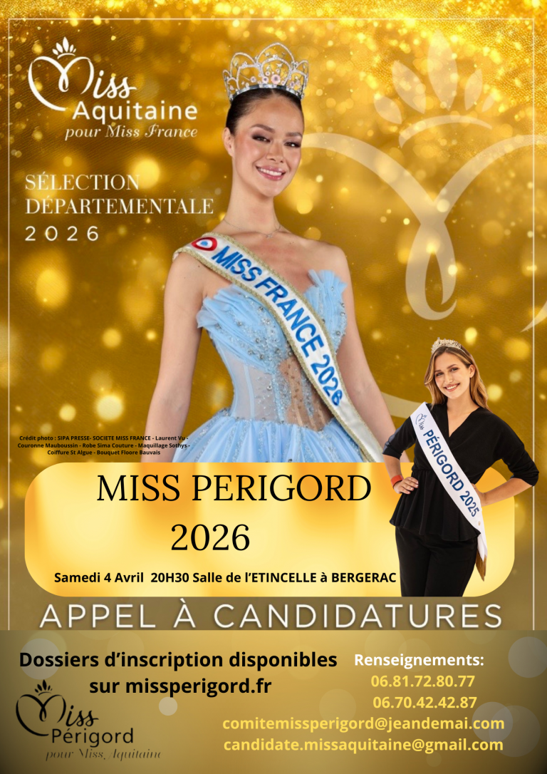 En ce qui concerne l’élection de Miss Périgord 2021 qui devrait se tenir au début de l’été prochain, nous vous informons que les candidatures sont ouvertes !