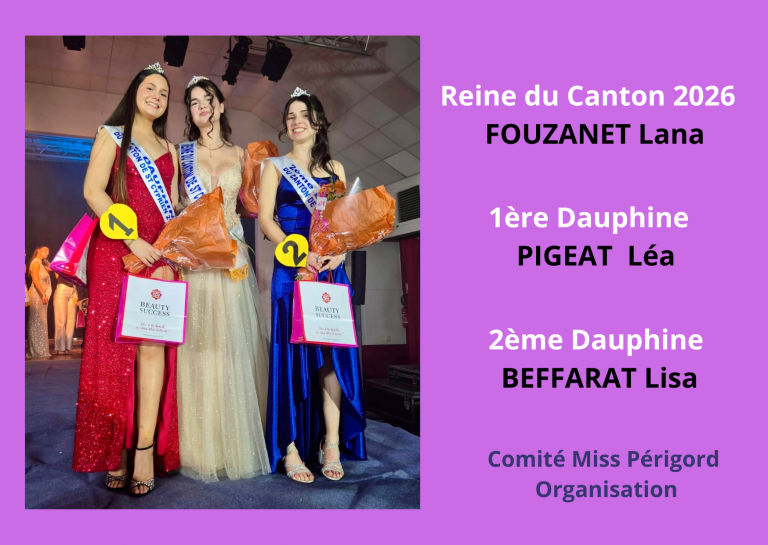 Le Comité Miss Périgord vous informe qu’en raison de la crise sanitaire, l’élection de la Reine du Canton n‘aura pas lieu cette année.